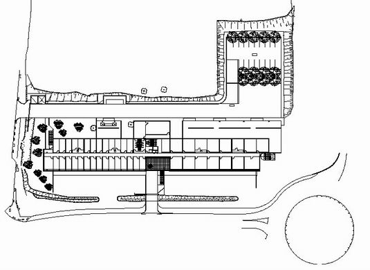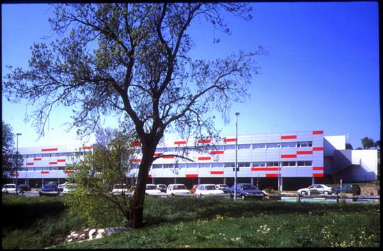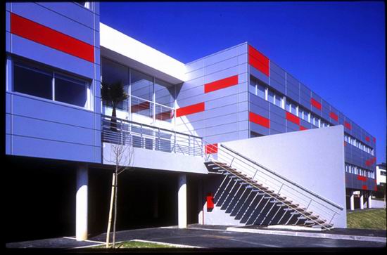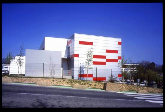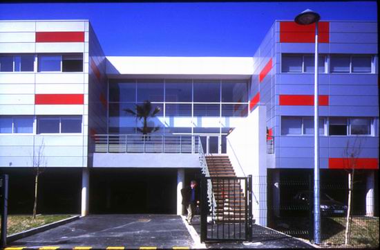 Le projet est implanté parallèlement aux courbes de niveaux et se présente comme un bâtiment linéaire posé sur des pilotis dont la façade principale se développe le long de la voie à l'Est du terrain. Deux niveaux identiques de bureaux se développent au-dessus des pilotis qui abritent un parking abrité de la pluie et du soleil. La façade principale sur la voie est " habillée " de cassettes de métal laqué ou brillant dans une disposition aléatoire, interrompue au centre par une vaste terrasse / accès principal et belvédère largement ouverte sur le paysage et la vue dégagée. Cette interruption laisse entrevoir le hall principal et les coursives de distribution intérieures. Plantée d'un palmier, elle constitue un espace de représentation pour le bâtiment et de détente pour les utilisateurs.