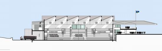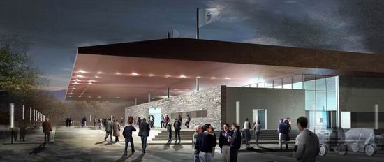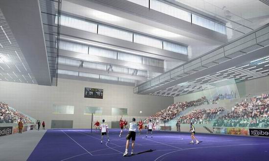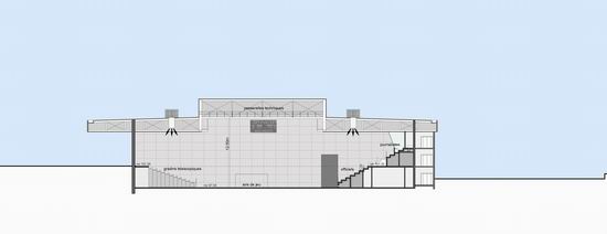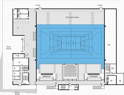 Lieu de rassemblement et de pratiques sporti ves collectives ou individuelles, l'architecture de cette salle revendique sa "modernité " - " modernité " du sport et de ses techniques toujours en évolution - " modernit é " des jeunes qui la pratiqueront. Compte tenu de la topographie du terrain et de son caractère naturel, ce projet ne cherche pas à déployer des formes " arrogantes ou futuristes " et ne cherche pas non plus à faire croire que des réminiscences d'architecture vernaculaires pourraient faire " se fondre " le projet dans le paysage environnant.Cette salle est avant tout un objet de " son temps " que les Ajacciens s'approprieront sans difficultés. Ancrée dans la pente, elle offre à la vue l'image reconnaissable d'un vaste toit débordant qui dessine une belle ligne horizontale dans ce terrain en pente Les stationnements organisés en " restanques " soulignent l'horizontalité et les lignes parallèles qui se succè- dent dans la pente renforcent l'assise du bâtiment..