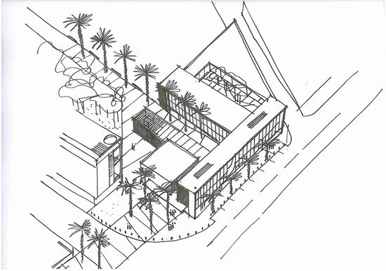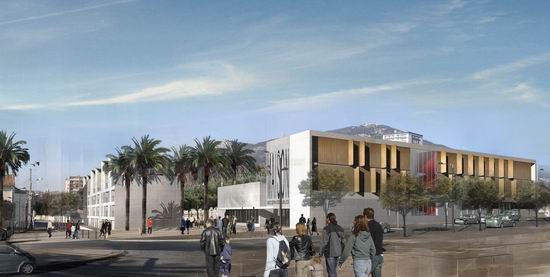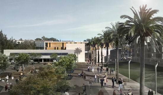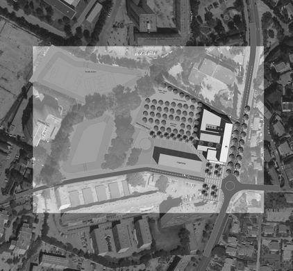 Le projet se lit comme un « bâtiment à deux faces » dans le but d'assurer des relations ville / parc urbain différenciées : - Coté ville, le projet renvoie au vocabulaire urbain de la rue : gabarit régulier, alignement, accès identifiables aux différents pôles. - Coté parc, le projet amorce une progression des volumes qui décroissent vers le parc, organise des transparences et des liaisons fluides entre le parc urbain, le parking, les halls. Le volume dominant du projet s?implante parallè- lement au Boulevard des Armaris qui constitue l?axe majeur de perception. Sa volumétrie respecte les directions du site, elle constitue aussi une barrière protectrice pour le parc urbain. La volumétrie générale et la cohérence des niveaux desservis offre une perception équilibrée des bâtiments depuis la rue mais également depuis le parc.