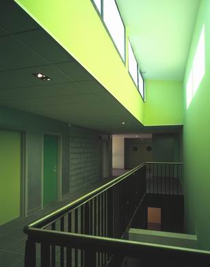 Le paysage est celui d’un grand village de Provence un peu retiré à l’intérieur des terres. C’est de loin la perception d’un grand plateau presque infini et découpé par de grandes haies d’arbres qui retient l’attention. Le projet de ce collége 600 s’installe sans contorsion dans ce paysage rural . Un grand porche d’accès marque la limite avec le village .A l’intérieur le collège s’organise autour de coursives extérieures et de galeries rythmées par des plantations de pommiers en pots.L’univers rural reste présent au coeur des espaces d’enseignement.