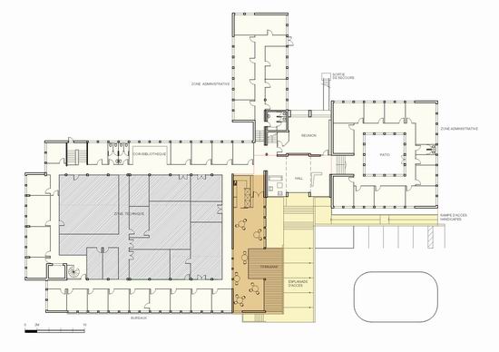 Pour faire face à un développement accéléré, la société INNATE PHARMA a choisi d’installer ses laboratoires et ses bureaux dans le bâtiment construit en 1970 pour abriter le centre régional d’informatique. Le projet répond à la nécessité d’une remise en état des façades abîmées par le temps. Parallèlement, il prend en considération le besoin « d’image » souhaité par la société. Ainsi, les façades orientées à l’Ouest reçoivent un nouveau système de brise-soleil dont la conception est destinée à filtrer la lumière et à étirer le bâtiment. L’organisation d’une cafétéria génère sur la façade sud la création d’une terrasse qui en lui donnant de l’épaisseur accompagne et re-qualifie l’accès principal au bâtiment. Une esplanade sera également aménagée devant le hall pour valoriser l’accès général et écarter les voitures du bâtiment.