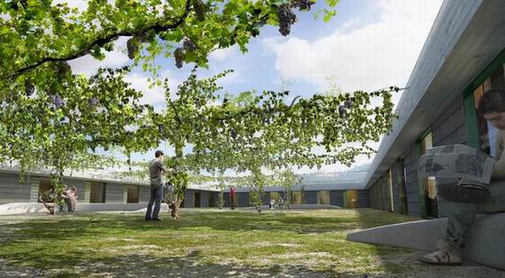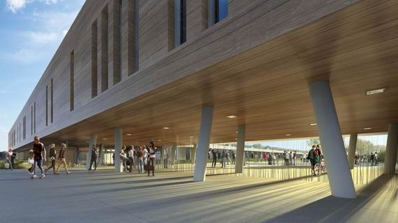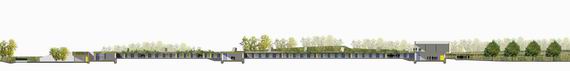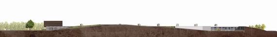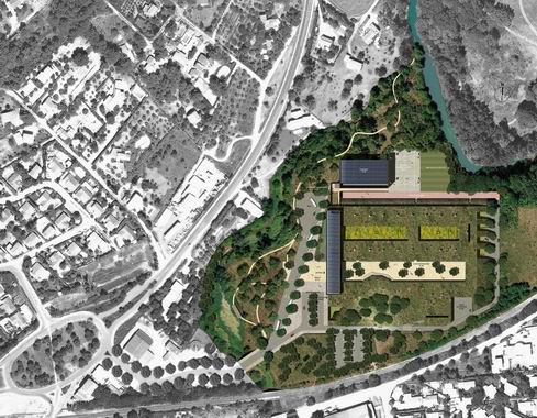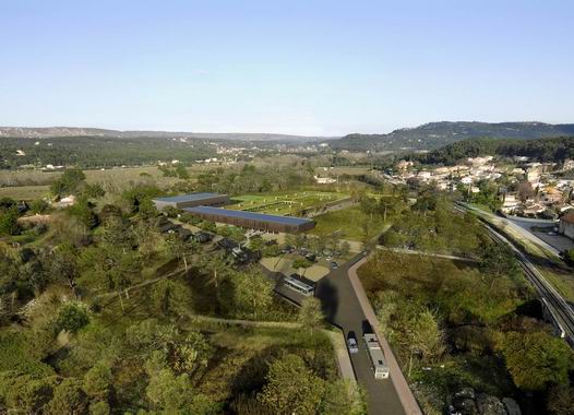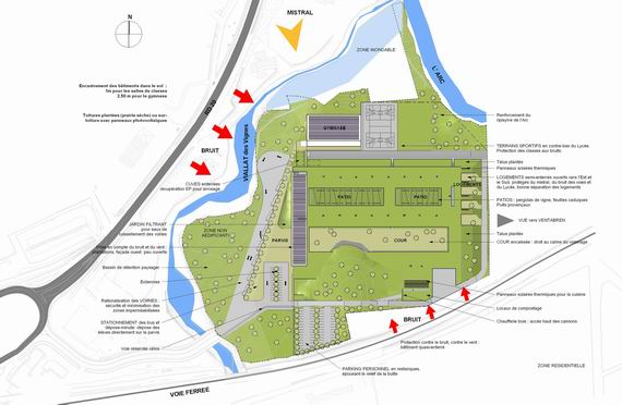 La forme et la hauteur du Lycée résultent de la confrontation du site et du programme avec une idée directrice qui est celle de l’intégration par effacement : le projet bien qu’au milieu de zones pavillonnaires se trouve au cœur d’un «paysage intérieur» préservé par la qualité arborée de ses limites : celles de la Ripysilve du Vallat des Vignes et de sa confluence avec celle de l’Arc mais également par celles visuelles que constituent les paysages lointains. Le Lycée se développe dans la partie sud quasiment en totalité en rez-de-chaussée semi enterré, il est surmonté d’une toiture plantée d’une prairie rustique qui permet de prolonger visuellement la grande plaine agricole qui s’étend à l’Est. Deux écritures architecturales cohabitent, celle horizontale et minimaliste des gabarits de façades épousant le sol et celle plus intimiste et rythmée des façades dont les matériaux utilisés répondent à cette volonté d’intégration.