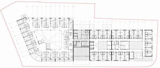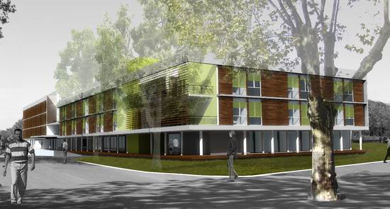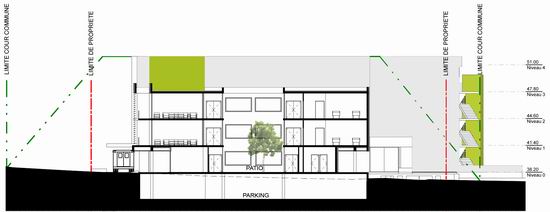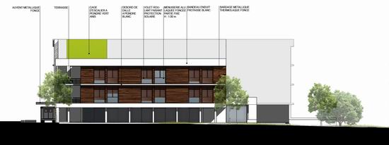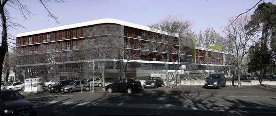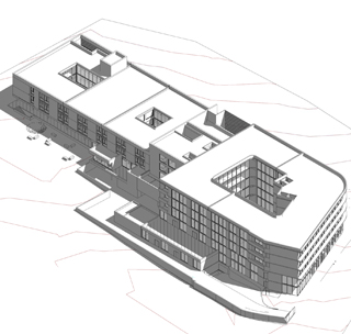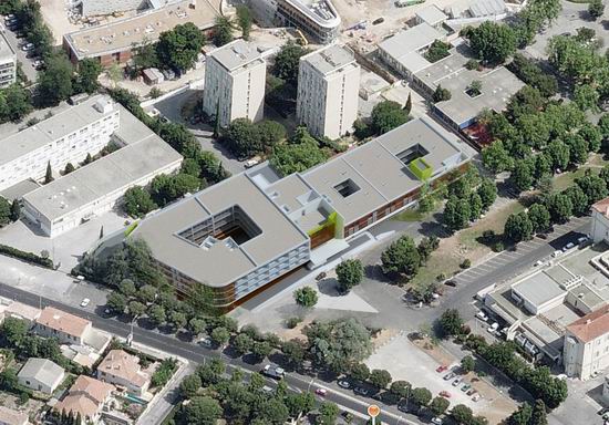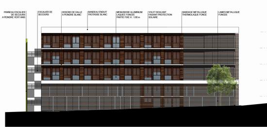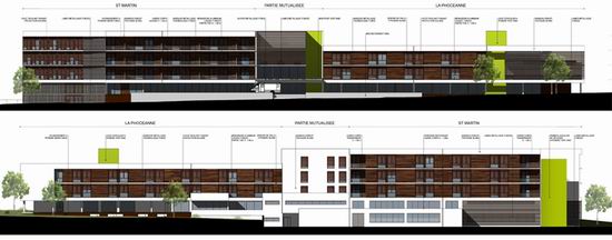 L e projet uni deux programmes qui se ré partissent de part et d’autre d’un bâtiment central intégrant des locaux mutualisés. Il s’organise en s’étirant le long de la grande longueur du terrain. Une rampe à faible pente permet de gérer la légère déclivité longitudinale et d’amener les voitures devant le hall central. Un cheminement parallèle est prévu pour l’accessibilité PMR. Cette organisation révèle ici des « lignes horizontales qui dialoguent avec le bâtiment principal de l’hôpital qui lui fait face ». Suivant la pente, les volumes étirés d’Ouest en Est offre à la vue des volumes différents dans leurs gabarits, ces derniers tenant compte des différences de programmes entre les deux maître d’ouvrage. De ce fait, un niveau de rez de chaussée référent constitue sur la longueur un socle en retrait qui allège le bâtiment.