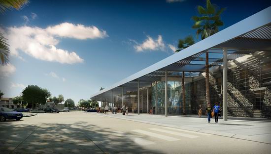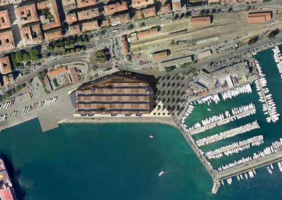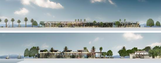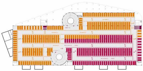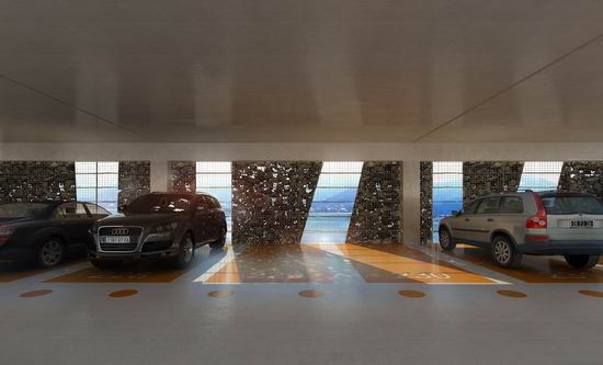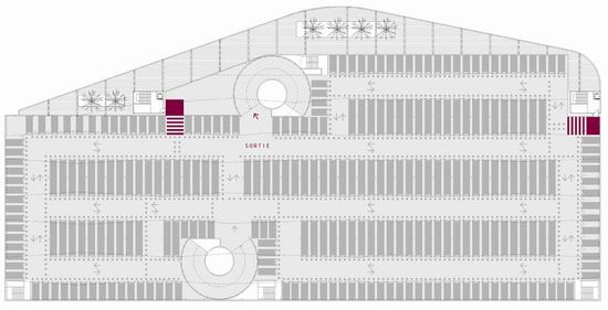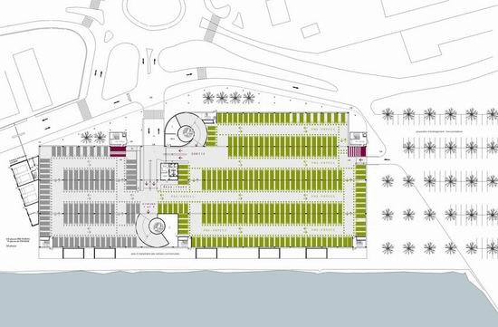Pour répondre aux objectifs combinés d’une image valorisante pour la ville et d’une vrai maîtrise économique, l’idée de ce projet est de proposer un éco - parking en super structure légèrement enterré, très ventilé naturellement et dont l’épaisseur se limite à 75 m. Très étiré en longueur il définit un premier plan sur la baie et l’horizon de la ville. La conception renvoie aussi à la nécessité de répondre à l’enjeu visuel dans le paysage d’entrée de ville. Une grande ombrière courbe souligne et protège la façade et l’accès tournés vers la ville. Elle délimite un grand parvis public qui donne au bâtiment une dimension à l’échelle d’un grand équipement