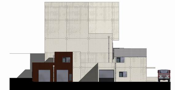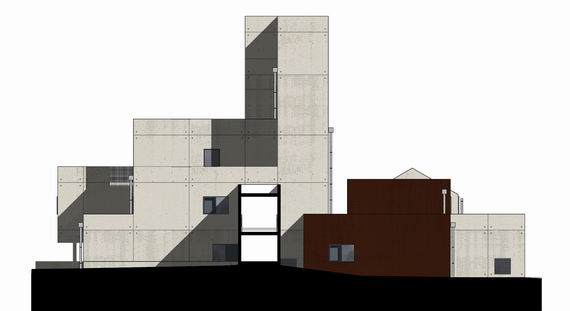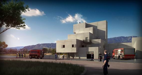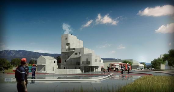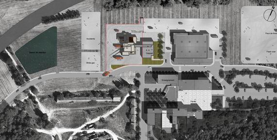 Il est nécessaire que l’architecture de la future maison à feux entretienne avec ce bâtiment existant un rapport formel complémentaire. Pour autant, compte tenu de la spécificité du programme liée aux très nombreuses configurations d’exercices, l’écriture architecturale du projet ne peut pas et ne doit pas s’établir par mimétisme. Ce projet cherche donc dans le site retenu, une autonomie formelle respectueuse de celle de l’école et en adéquation avec le programme et le site. Notre proposition trouve son fil conducteur architectural dans les lignes contemporaines de la future école et dans les nombreux découpages de volumes. La modénature des façades faites de pleins et de vides très fortement exprimés et de parties de bâtiments posés sur poteaux renforcent cette idée d’un bâtiment moderne, lisible et fonctionnel.
