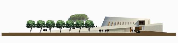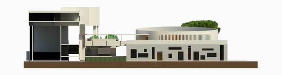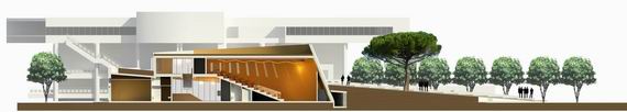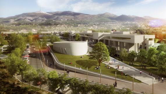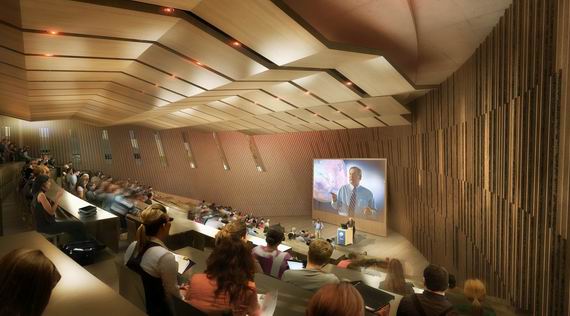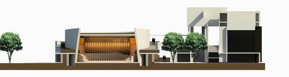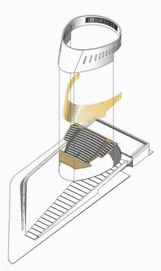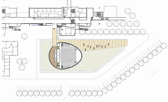 Situé en tête de la barre de l’école centrale, le projet d’extension vient terminer naturellement la composition des différents satellites dans un emplacement encore libre. Par son implantation mais aussi par l’ambition de son programme, cette extension veut constituer un élément fort de l’Ecole à la fois dans sa représentativité et dans son fonctionnement. Les espaces extérieurs seront remaniés de façon à retraiter l’accès sud comme une future entrée possible au site. Son positionnement à l’opposé du hall principal de l’Ecole mais aussi à l’extrémité Sud devant une entrée secondaire possible implique de multiples possibilités d’accès : Au niveau bas, de part et d’autre d’un hall traversant. D’un côté à l’Ouest sur la voie de contournement. Au niveau haut, par une passerelle directement connectée sur la rue haute et par une longue et grande forme de terre venant envelopper le volume de l’amphithéâtre et permettant une liaison douce et harmonieuse entre le haut et le bas, et générant de nouvelles pratiques. L’amphithéâtre se décline entre ces deux niveaux. Sa forme ovoïde favorise un confort optimum de vision – large en fond, plus étroit devant avec une disposition des fauteuils en arc de cercle focalisant sur la scène.