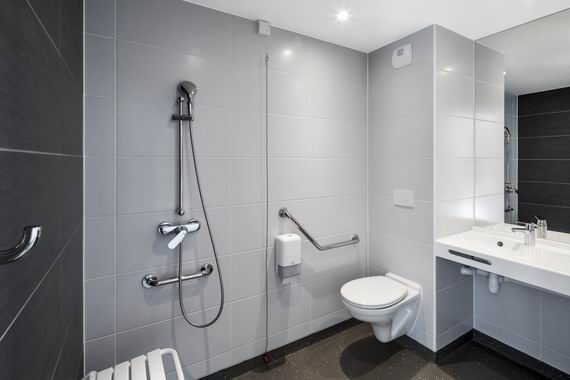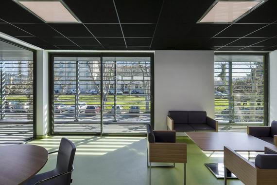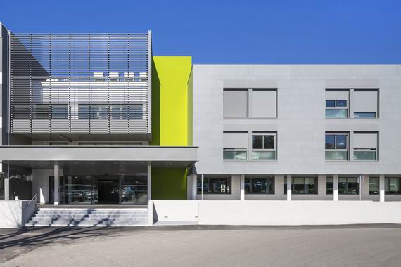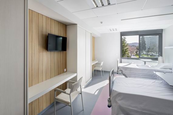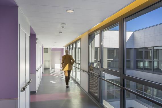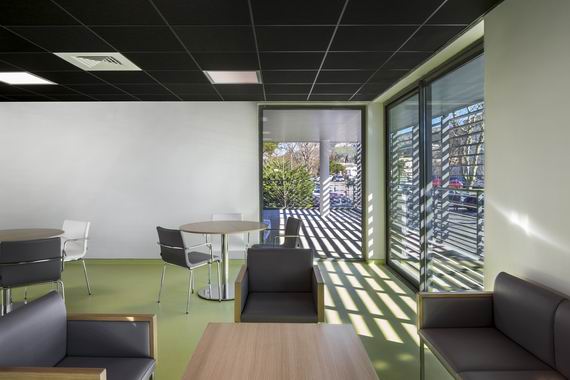 Le projet unit deux programmes qui se répartissent de part et d’autre d’un bâtiment central intégrant des locaux mutualisés. Il s’organise en s’étirant le long de la grande longueur du terrain. Une rampe à faible pente permet de gérer la légère déclivité longitudinale et d’amener les voitures devant le hall central. Un cheminement parallèle est prévu pour l’accessibilité PMR. Cette organisation révèle ici des « lignes horizontales qui dialoguent avec le bâtiment principal de l’hôpital qui lui fait face ». Suivant la pente, les volumes étirés d’Ouest en Est offre à la vue des volumes différents dans leurs gabarits, ces derniers tenant compte des différences de programmes entre les deux maître d’ouvrage. De ce fait, un niveau de rez de chaussée référent constitue sur la longueur un socle en retrait qui allège le bâtiment.