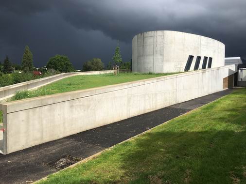 Situé en tête de la barre de l’école centrale, le projet d’extension vient terminer naturellement la composition des différents satellites dans un emplacement encore libre. Par son implantation mais aussi par l’ambition de son programme, cette extension veut constituer un élément fort de l’Ecole à la fois dans sa représentativité et dans son fonctionnement. Les espaces extérieurs seront remaniés de façon à retraiter l’accès sud comme une future entrée possible au site. Son positionnement à l’opposé du hall principal de l’Ecole mais aussi à l’extrémité Sud devant une entrée secondaire possible implique de multiples possibilités d’accès : Au niveau bas, de part et d’autre d’un hall traversant. D’un côté à l’Ouest sur la voie de contournement. Au niveau haut, par une passerelle directement connectée sur la rue haute et par une longue et grande forme de terre venant envelopper le volume de l’amphithéâtre et permettant une liaison douce et harmonieuse entre le haut et le bas, et générant de nouvelles pratiques. L’amphithéâtre se décline entre ces deux niveaux. Sa forme ovoïde favorise un confort optimum de vision – large en fond, plus étroit devant avec une disposition des fauteuils en arc de cercle focalisant sur la scène.
