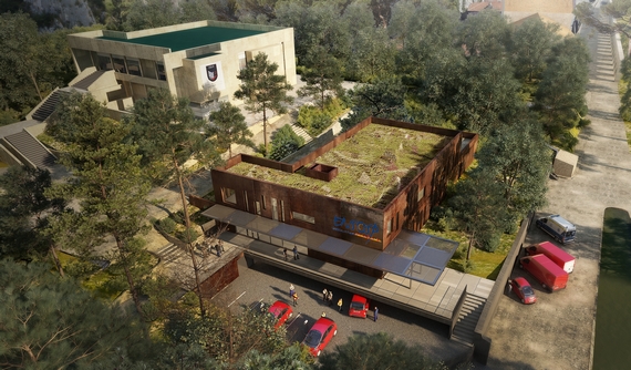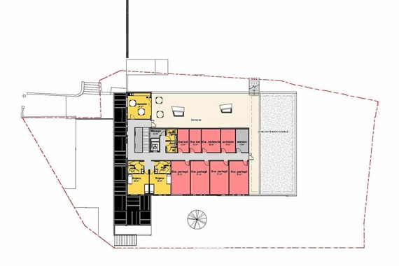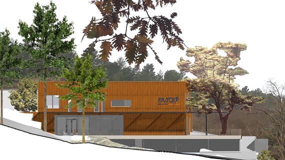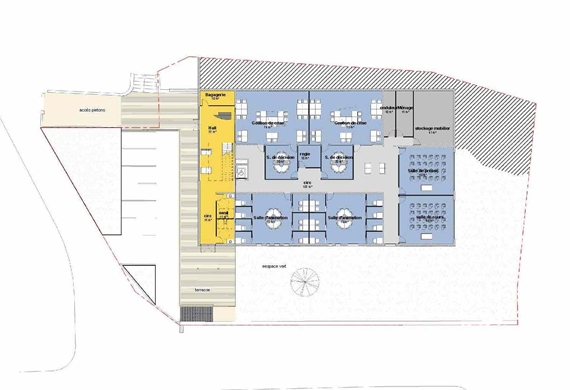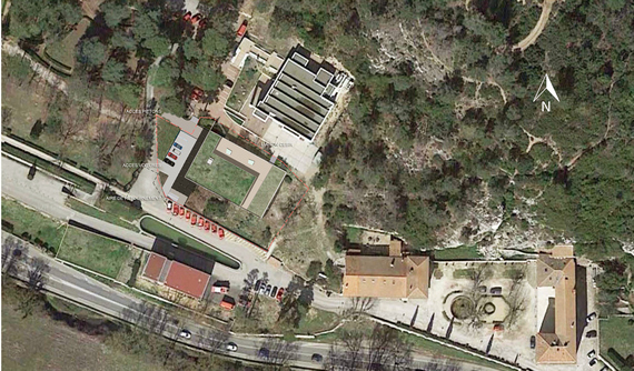 Construit sur le flanc Sud de la vallée reliant Gardanne et les Milles, le site de l’ENSOSP a été façonné dans le temps pour ordonnancer un paysage naturel. A partir du château calé dans la partie Est, des lignes se dégagent en suivant les courbes de niveaux. Elles se matérialisent par la voie d’accès principale, le dessin des jardins, le bassin et le mur de soutènement bordant le terrain dévolu à l’opération. Ce terrain fait donc partie d’une composition globale qui ne doit pas être contredite. La direction de l’implantation est donc donnée par ce mur de soutènement et par le bâtiment CESIR situé au-dessus. La déclivité du terrain conduit à penser le calage du futur bâtiment en plusieurs plateformes successives se raccordant aux différents niveaux de la voie de desserte existante.Les façades seront recouvertes de tôles d’acier laquées façon « CORTEN » mises en oeuvre devant l’isolation thermique extérieure. Elles rappellent celles des autres sites de l’ENSOP, comme un clin d’oeil pour unifier les fonctions.